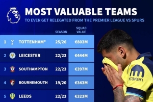 8.03亿欧!若热刺降级,将打破英超降级球队最高身价纪录