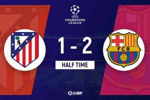 上半场伤停补时4分钟,半场结束,巴萨暂2-1马竞。